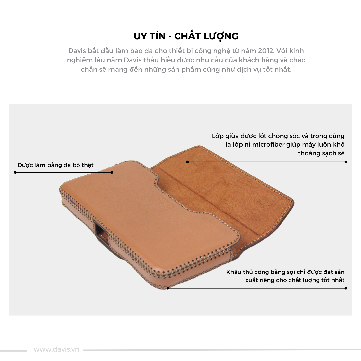 • Với kinh nghiệm sản xuất đồ da từ năm 2012, Davis sẽ mang tới cho bạn sản phẩm và dịch vụ tốt nhất.
