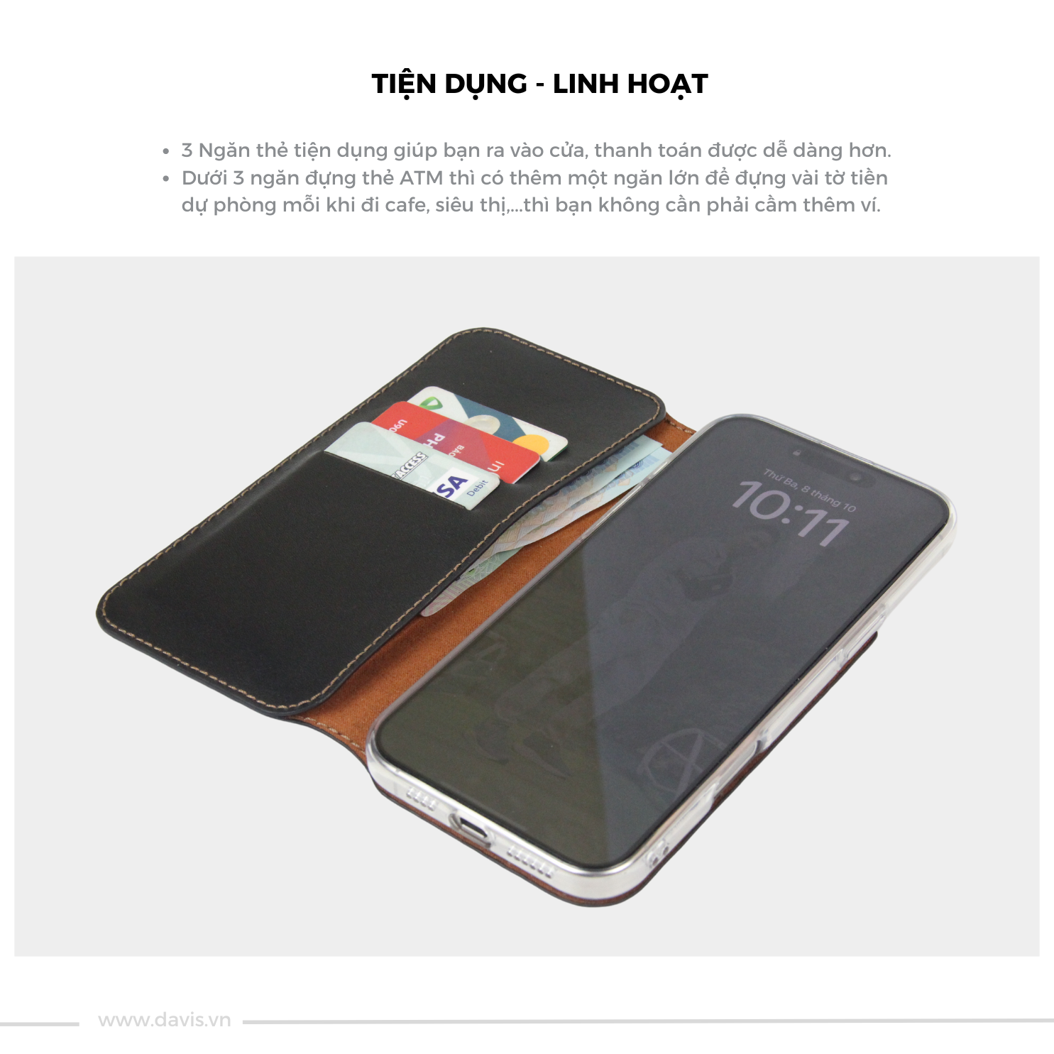• Điểm đặc biệt khi mua bao da của Davis là bạn có thể cá nhân hoá bao da. Bạn có thể khắc tên, chữ, số hay hình ảnh nào mà mình thích nhằm tạo sự khác biệt mà chỉ bạn sở hữu hoặc làm món quà tặng thêm ý nghĩa.
